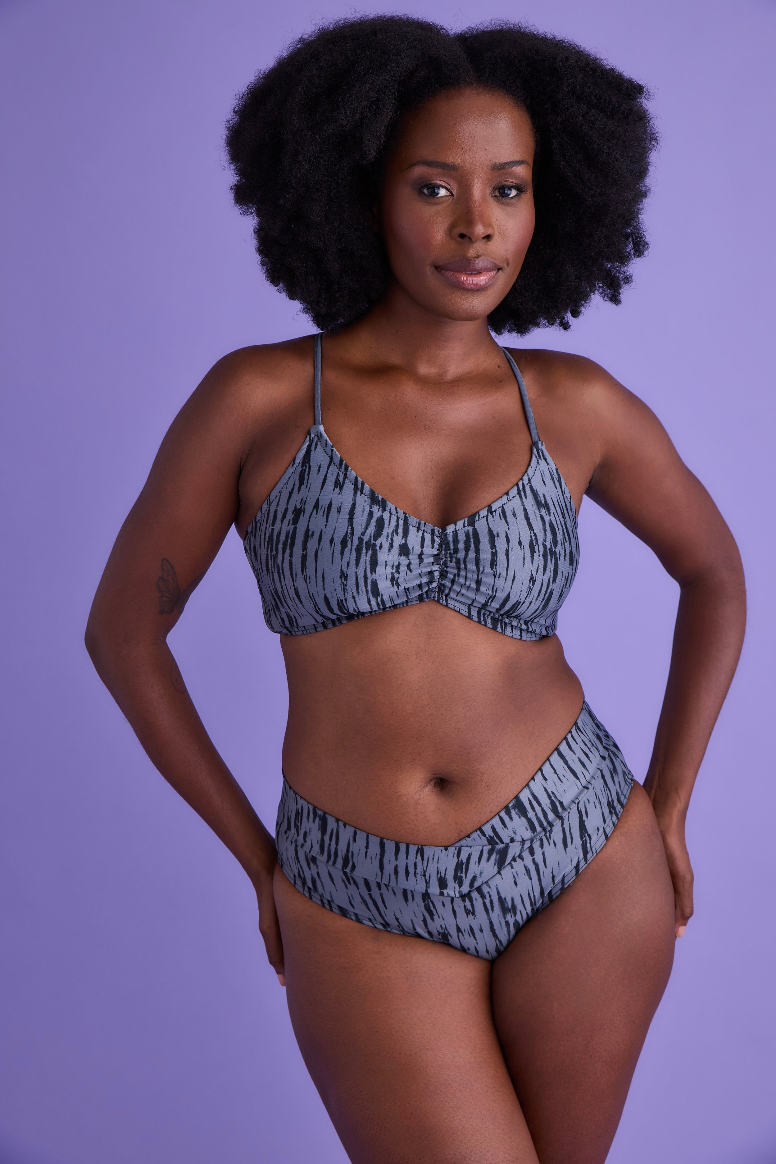 A strappy V-tank bikini top paired with our new V-sash bottom, designed to flatter, support, and feel incredibly comfortable.